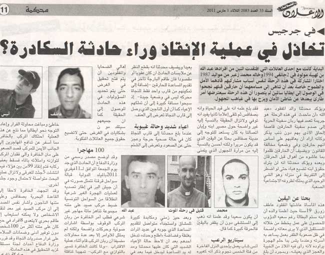 جريدة الإعلان التونسية أتحفتنا بالخبطة الصحفية الأكبر والأهم ليوم أمس لتثبت أن ثمنها الذي يناهز 700 مليم لتكون الصحيفة الأكثر ثمنا بين البقية لم يأت من فراغ وأنها تستحق كل مليم يدفعه المواطن المسكين من جيبه ليقتنيها..في الصفحة 11 نشرت جريدتنا تحقيقا مطولا عن مأساة ضحايا الهجرة السرية نحو ايطاليا التي كانت مدينة جرجيس مسرحا لها..