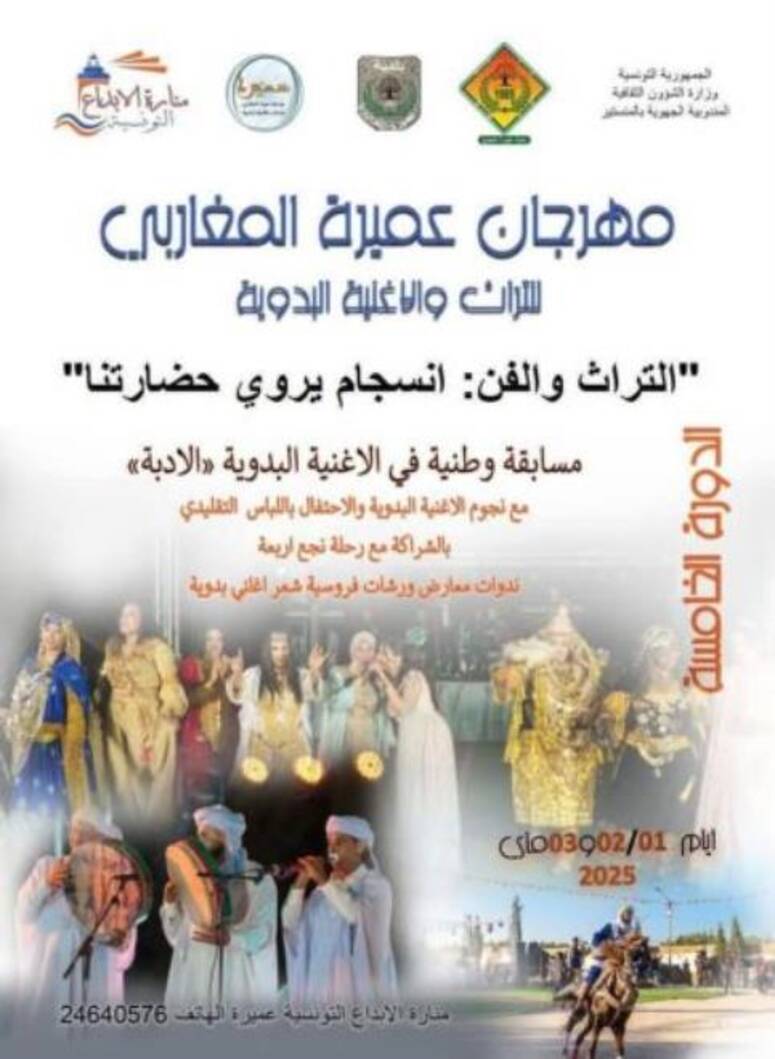 تنظم جمعية"منارة الإبداع التونسية" أيام 1 و2 و3 ماي 2025 بالشراكة مع بلدية عميرة الحجاح، الدورة الخامسة " لمهرجان عميرة المغاربي للتراث والأغنية البدوية" .