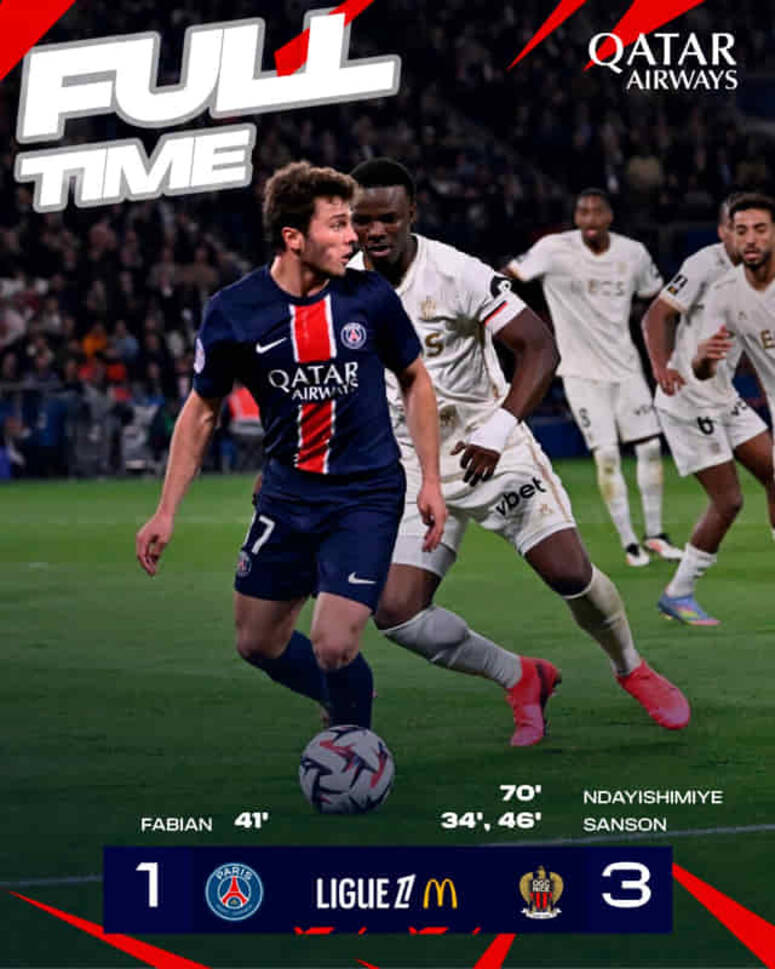 مني فريق باريس سان جيرمان بخسارته الأولى في البطولة الفرنسية لكرة القدم هذا الموسم، بعدما خسر امس الجمعة أمام ضيفه نيس 1-3 في افتتاح مباريات الجولة الحادية والثلاثين من المسابقة.