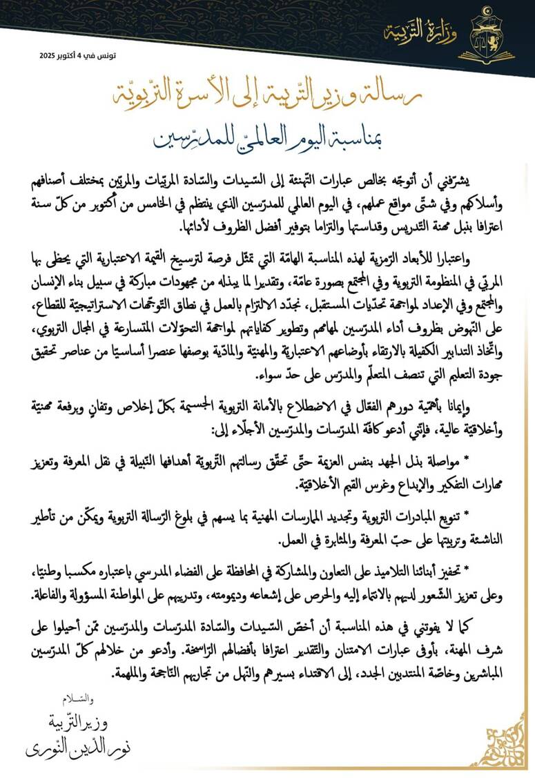 ودعا بالمناسبة كافة المدرسات والمدرّسين إلى مواصلة بذل الجهد بنفس العزيمة حتى تحقّق رسالتهم التربوية أهدافها النبيلة في نقل المعرفة وتعزيز مهارات التفكير والإبداع وغرس القيم الأخلاقية وتنويع المبادرات التربوية وتجديد الممارسات المهنية بما يسهم في بلوغ الرسالة التربوية ويمكّن من تأطير الناشئة وتربيتها على حب المعرفة والمثابرة في العمل.