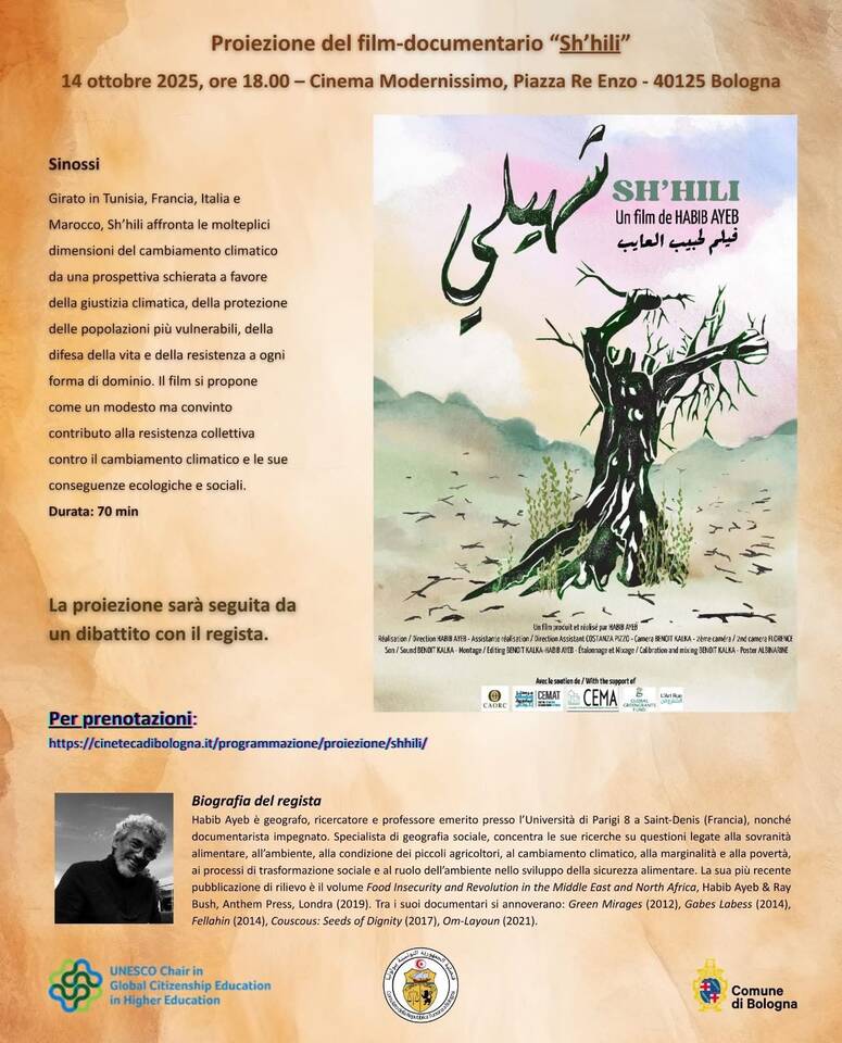 ويتضمن البرنامج لقاءات سيتم خلالها إستحضار تاريخ هجرة الايطاليين إلى تونس وعرض للفيلم الوثائقي "شهيلي" حول تحديات التغيرات المناخية بالمتوسط يليه نقاش مع مخرجه التونسي، الحبيب العايب.