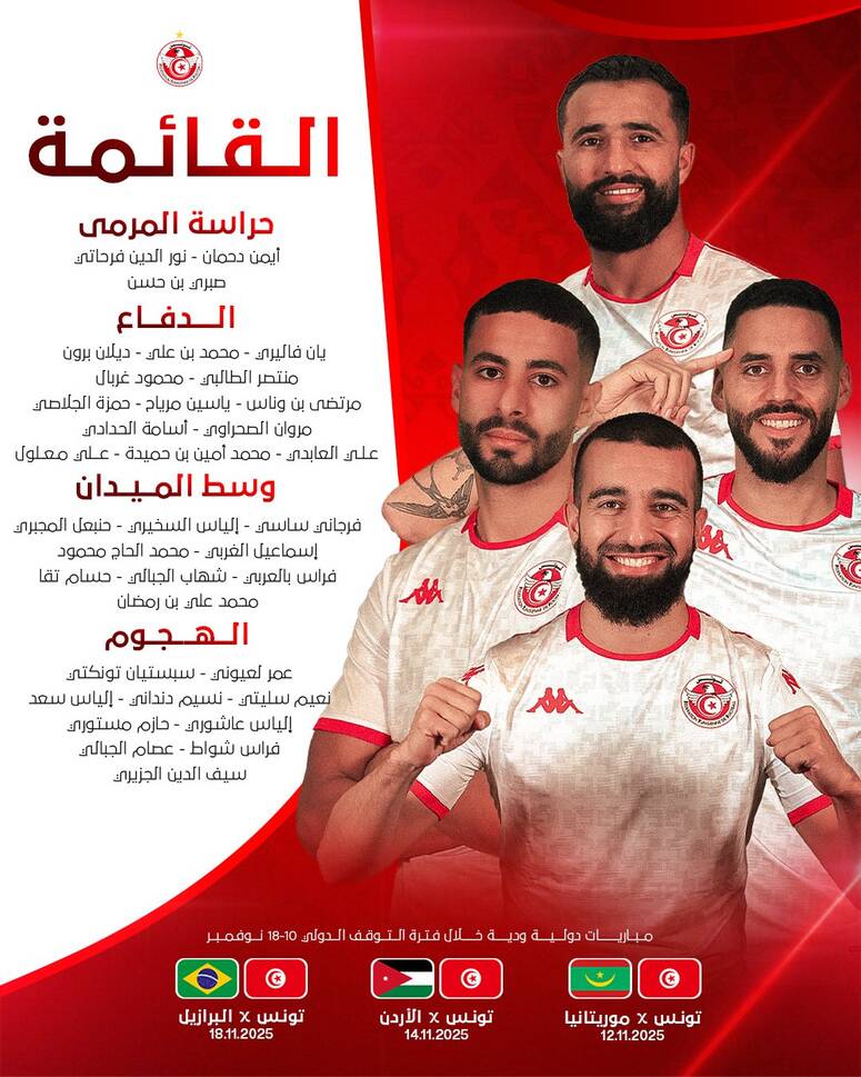 كشف الناخب الوطني سامي الطرابلسي اليوم الأحد، في البرنامج التلفزي "الأحد الرياضي" على قناة الوطنية الأولى، عن قائمة المنتخب التونسي لكرة القدم استعدادًا للمباريات الودية الثلاث القادمة أمام موريتانيا والأردن والبرازيل، المبرمجة من 12 إلى 18 نوفمبر الجاري ضمن النافذة الدولية لأيام الفيفا.