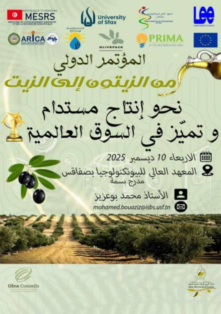 ينظم المعهد العالي للبيوتكنولوجيا بصفاقس يوم الأربعاء 10 ديسمبر المقبل المؤتمر الدولي "من الزيتون إلى الزيت... نحو إنتاج مستدام وتميّز في السوق العالمية"، وذلك بمقر المعهد.
