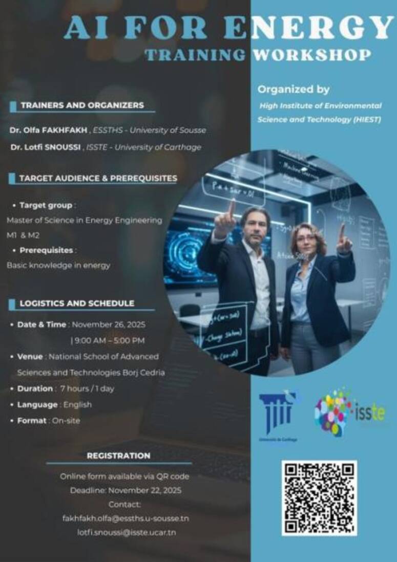 ورشة تدريبية بعنوان "الذكاء الاصطناعي من أجل الطاقة" بالمدرسة الوطنية للعلوم والتقنيات المتقدمة ببرج السدرية يوم 26 نوفمبر