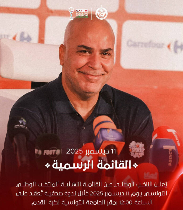 وعلى صعيد اخر سيعلن مدرب المنتخب الوطني سامي الطرابلسي عن القائمة النهائية للاعبين الذين سيشاركون في "كان المغرب" يوم 11 ديسمبر خلال ندوة صحفية سيعقدها بمقر الجامعة بداية من الساعة 12.