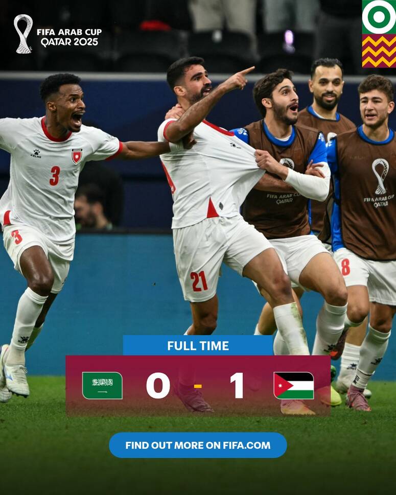 كأس العرب 2025: الأردن يضرب موعدًا مع المغرب في النهائي بعد إقصاء السعودية