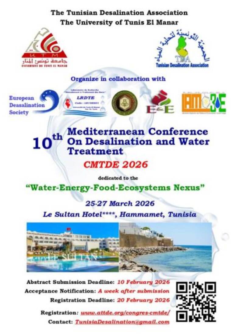 تنظم كل من، الجمعية التونسية لتحلية المياه وجامعة تونس المنار، الدورة العاشرة من، مؤتمر البحر الأبيض المتوسط حول تحلية المياه ومعالجتها ، وذلك من 25 إلى 27 مارس 2026 بمدينة الحمامات.