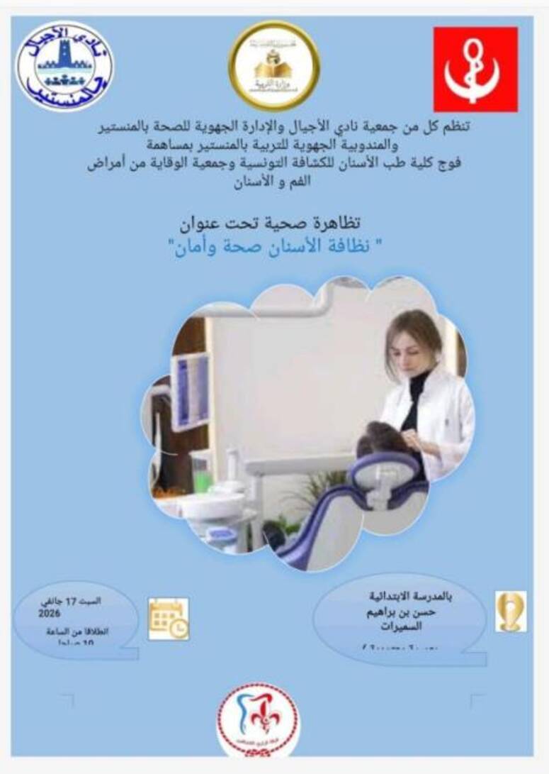 تنظم جمعية نادي الاجيال بالتعاون مع الادارة الجهوية للصحة والمندوبية الجهوية للتربية وفوج كلية طب الاسنان للكشافة التونسية بالمنستير، قافلة صحية، وذلك يوم السبت 17 جانفي الجاري، بالمدرسة الابتدائية السميرات بعميرة التوازرة من ولاية المنستير