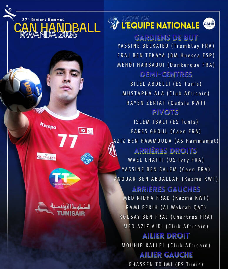 أعلن الناخب الوطني محمد علي الصغير، اليوم الأربعاء، عن قائمة لاعبي المنتخب التونسي لكرة اليد المدعوّين للمشاركة في نهائيات كأس إفريقيا للأمم، المقرّرة بـرواندا من 21 إلى 31 جانفي 2026.