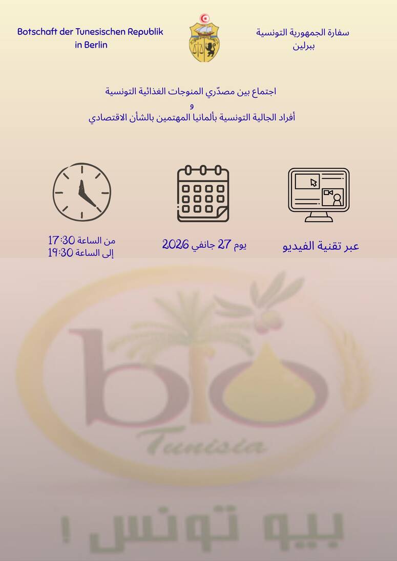 من المنتظر أن تنظم، سفارة الجمهورية التونسية ببرلين، تظاهرة بتقنية الفيديو (عن بعد)، لفائدة أبناء الجالية المقيمة بألمانيا والمهتمة بالشان الاقتصادي، وذلك يوم الثلاثاء 27 جانفي الجاري.