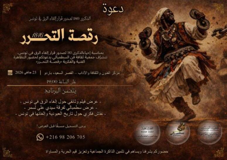 ويأتي تنظيم هذه الفعالية في إطار إحياء الذكرى الـ180 لصدور قرار إلغاء الرق في تونس الذي أصدره أحمد باي بتاريخ 23 جانفي 1846.
