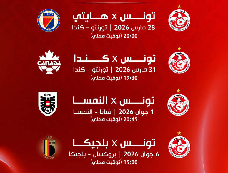 وسيواجه المنتخب التونسي خلال هذه الفترة منتخبات هايتي وكندا والنمسا وبلجيكا، وفق البرنامج التالي: