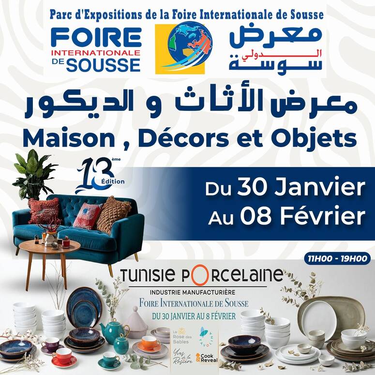يحتضن، معرض سوسة الدولي، الدورة الثالثة عشرة لمعرض الأثاث والديكور من 30 جانفي إلى 08 فيفري 2026.
