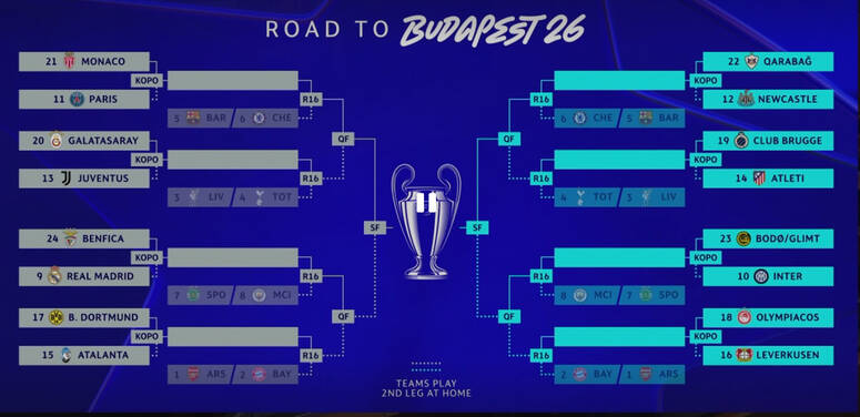 كما أوقعت القرعة كاراباخ أمام نيوكاسل يونايتد، وكلوب بروج ضد أتلتيكو مدريد، فيما يلتقي أولمبياكوس مع باير ليفركوزن.