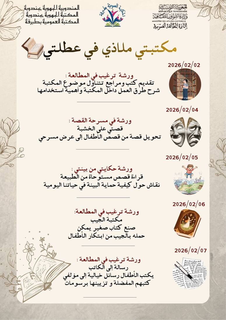 تنظم، المكتبة العمومية بطبرقة، تظاهرة "مكتبتي ملاذي في عطلتي"، وذلك من 02 الى 07 فيفري الجاري.