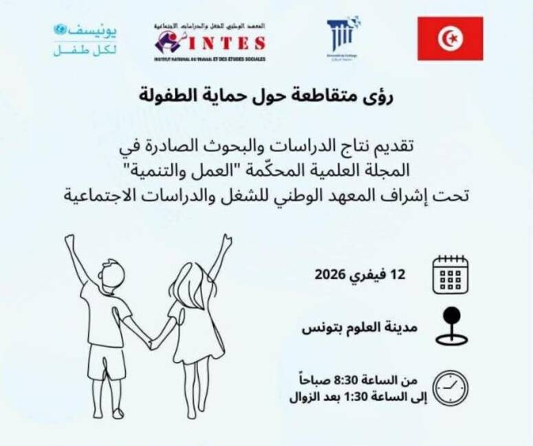 ينظم، المعهد الوطني للشغل والدراسات الاجتماعية، بالتعاون مع، مكتب اليونيسف بتونس، تظاهرة علمية، يوم 12 فيفري 2026 بمدينة العلوم، تخصص لاستعراض مخرجات العدد الخاص من مجلة "العمل والتنمية" حول حماية الطفولة.