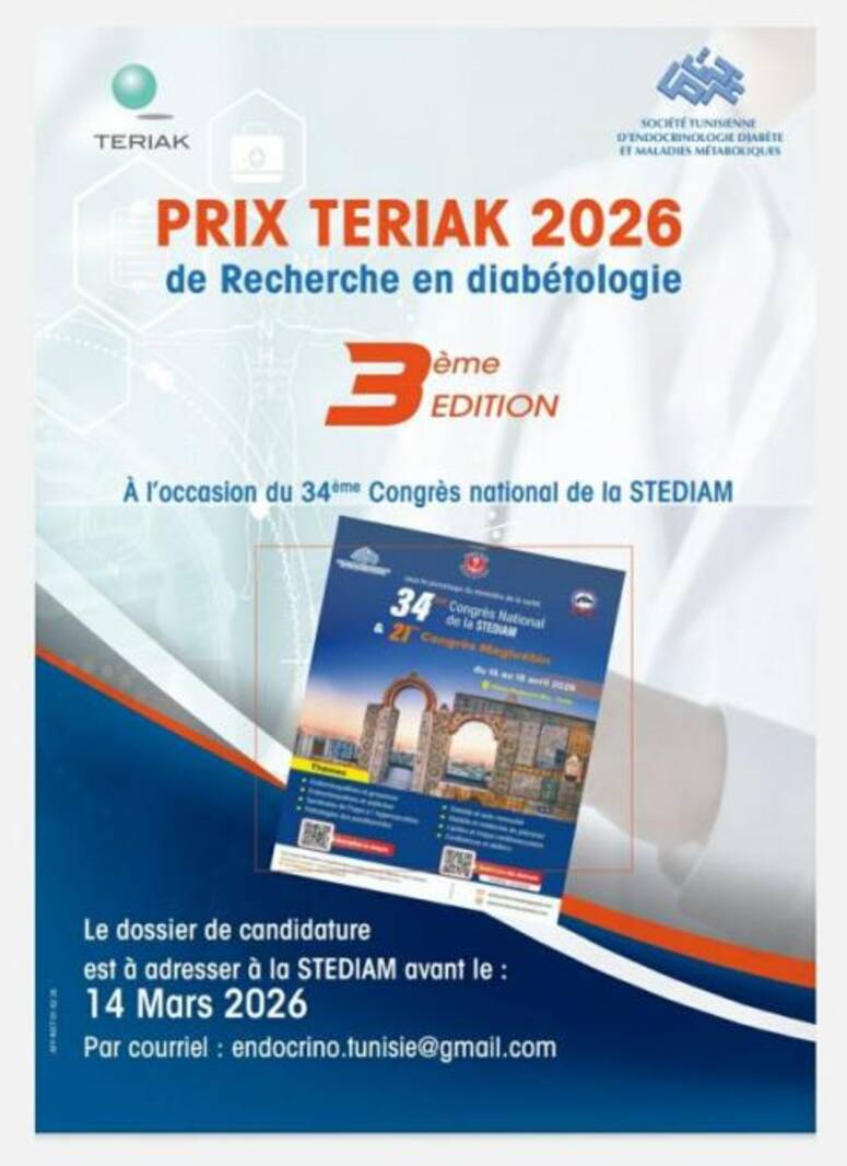 أعلنت الجمعية التونسية لطب الغدد الصماء والسكري والأمراض الاستقلابية عن فتح باب الترشح لنيل جائزة "ترياق" للبحث في داء السكري في دورتها الثالثة لسنة 2026، بمناسبة تنظيم المؤتمر الوطني الرابع والثلاثين للجمعية من 16 إلى 18 أفريل 2026.