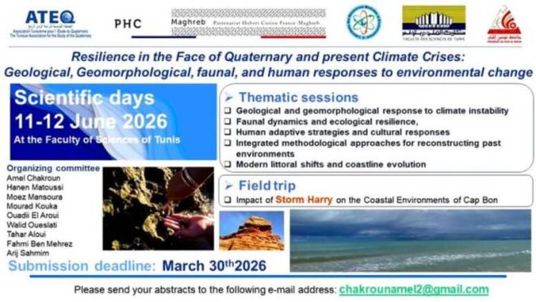 الايام العلمية بعنوان "المرونة في مواجهة ازمات المناخ في الزمن الرابع والراهن" يومي 11 و12 جوان 2026 بكلية العلوم بتونس