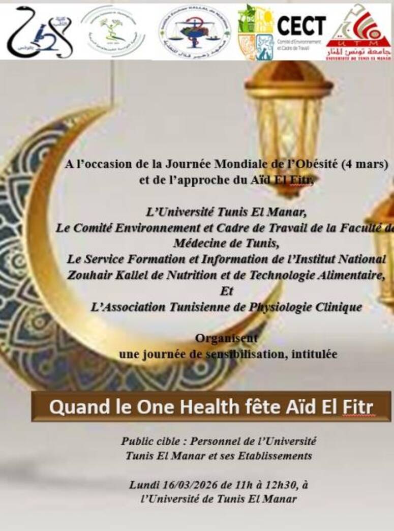 تنظم كل من جامعة تونس المنار وكلية الطب بتونس يوما تحسيسيا بعنوان "عندما تحتفل الصحة الواحدة بعيد الفطر"، وذلك يوم الاثنين 16 مارس بمقر جامعة تونس المنار.