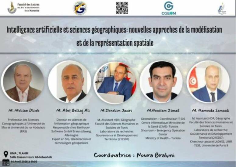 ينظم مخبر البحث Géomatiques des Géosystèmes يوما دراسيا حول الذكاء الاصطناعي والعلوم الجغرافية....مقاربات جديدة للنمذجة والتمثيل المكاني، يوم الثلاثاء 14 أفريل الجاري، بكلية الآداب والفنون والانسانيات بمنوبة