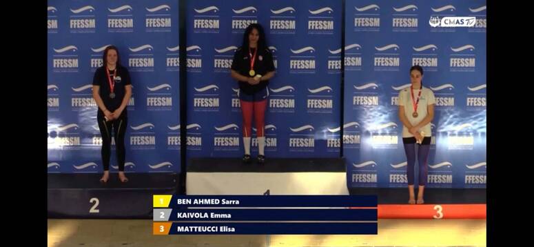 وجاءت الميدالية الذهبية عن طريق سارة بن أحمد في سباق 400م صنف وسطيات (زعنفتان) بتوقيت قدره 3دق و56ث و80 جزء بالمائة.