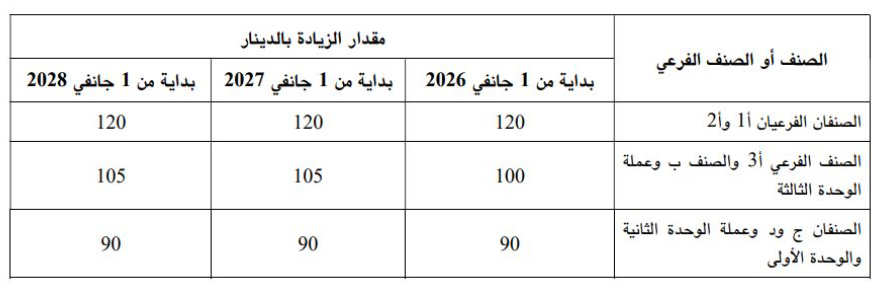 ووفق نصّ الأمر، تم ضبط مقادير الزيادات الشهرية حسب الأصناف المهنية، حيث تم إقرار زيادة قدرها 120 دينارا لفائدة الصنفين الفرعيين أ1 وأ2 بداية من 1 جانفي 2026، في حين تتراوح الزيادة بين 100 و105 دنانير بالنسبة للصنف أ3 والصنف ب، وبين 90 دينارا لبقية الأصناف، مع تدرّج في بعض الحالات خلال سنتي 2027 و2028.