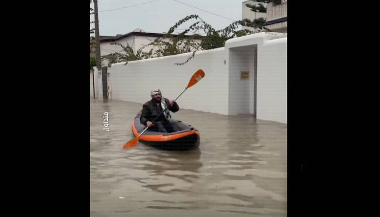 شابًا يقوم بالتزلّج فوق المياه وركوب الأمواج بعد جره بواسطة سيارة رباعية الدفع، فيما ظهر شخص آخر يتجوّل بزورق (كاياك) داخل الأزقة والأحياء التي غمرتها المياه، في لقطات لاقت تفاعلًا واسعًا على منصّات التواصل الاجتماعي.