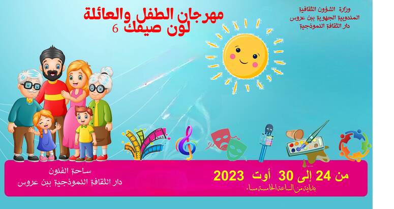 تحت شعار "لوّن صيفك" تنظم دار الثقافة النموذجية ببن عروس، الدورة السادسة من "مهرجان الطفل والعائلة" وذلك من 24 إلى 30 أوت 2023 .