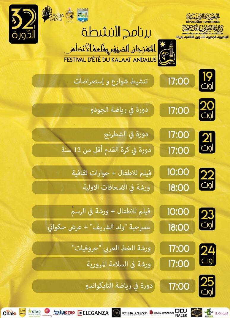 تحت إشراف المندوبية الجهوية للشؤون الثقافثة بأريانة وبالشراكة مع جمعية "كاسترا افنتس" وبلدية ومعتمدية المكان، تنطلق اليوم السبت 19 أوت فعاليات المهْرَجَان الصَّيْفِي بقلَعَة الأندلس لتتواصل إلى غاية يوم 26 أوت الجاري.