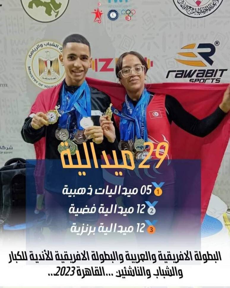 تالقت عناصر النخبة التونسية للشبان لرفع الاثقال خلال مشاركتها الاخيرة في منافسات البطولة الافريقية والعربية للعبة التي احتضنتها خلال شهر اكتوبر الجاري العاصمة المصرية القاهرة وذلك باحرازها 29 ميدالية منها 5 ذهبيات.