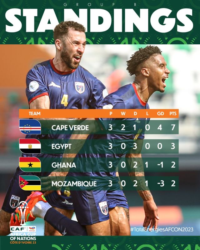 وعلى ضوء النتائج الحاصلة في المباراتين، أنهى منتخب الرأس الأخضر منافسات المجموعة الثانية في المركز الأول برصيد 7 نقاط متقدما على منتخب مصر الذي حل في المركز الثاني برصيد 3 نقاط بينما احتل منتخب غانا المركز الثالث بنقطتين بفارق الاهداف امام منتخب موزمبيق.