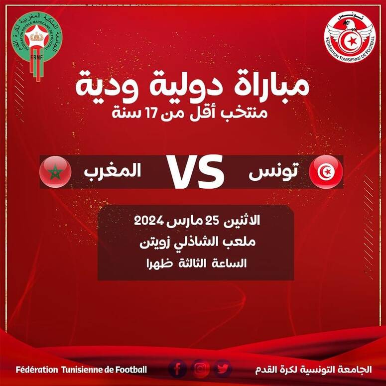 خسر المنتخب التونسي لاقل من 17 سنة امام نظيره المغربي بنتيجة 1-2 في المباراة الودية لكرة القدم التي جمعتهما اليوم الاثنين بملعب الشاذلي زويتن بالعاصمة.