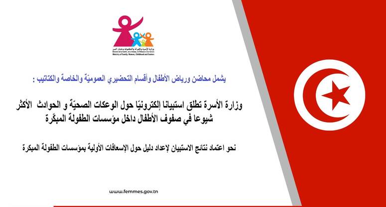 أطلقت وزارة الأسرة والمرأة والطفولة وكبار السن استبيانا إلكترونيا حول الوعكات الصحيّة و الحوادث  الأكثر شيوعا في صفوف الأطفال داخل مؤسسات الطفولة المبكّرة بمحاضن ورياض الأطفال وأقسام التحضيري العمومية والخاصة والكتاتيب من أجل استغلال نتائجه في اعداد دليل حول الاسعافات الأولية بهذه المؤسسات.