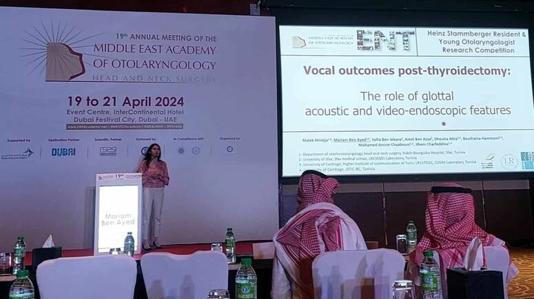 وقدّمت المشاركة التّونسيّة بحثا حول "النّتائج الصوتيّة بعد استئصال الغدّة الدرقيّة: دراسة السّمات الصوتيّة و المرئيّة بالمنظار"، تحت إشراف كلّ من الأساتذة مالك المنجة وصوفيّة جبارة و آمال بن عزّة.
