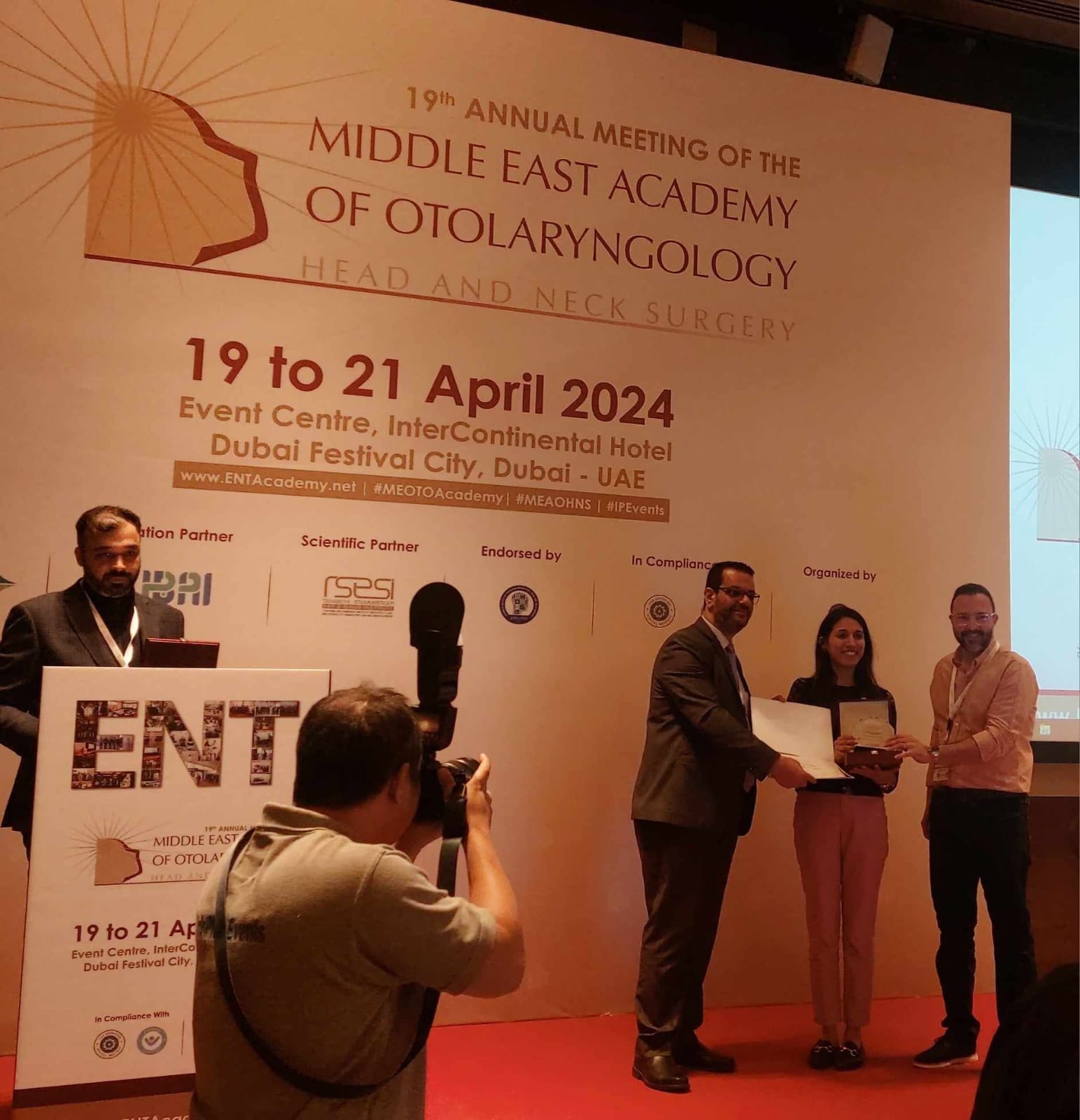 فازت الدكتورة مريم بن عيّاد الطبيبة المقيمة بقسم أمراض وجراحة الأذن والأنف والحنجرة والرّقبة بالمستشفى الجامعي "الحبيب بورقيبة" بصفاقس بالجائزة الأولى لأحسن بحث علمي من بين 300 مشارك من مختلف الدّول في مسابقة أكاديمية الشّرق الأوسط للأطبّاء الشّبان التّي جرت بدبي بدولة الإمارت العربيّة المتّحدة من 19 إلى 21 أفريل 2024 في اختصاص أمراض وجراحة الأذن والحنجرة والرّقبة.