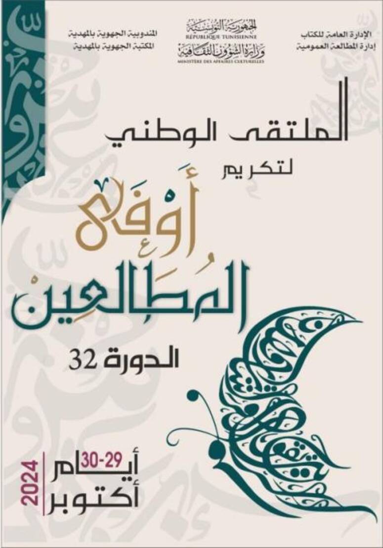 تستضيف مدينة المهدية يومي الثلاثاء والأربعاء 29 و30 أكتوبر فعاليات الدورة الثانية والثلاثين من الملتقى الوطني لأوفى المطالعين، الذي تنظمه إدارة المطالعة العمومية بالإدارة العامة للكتاب تحت إشراف وزارة الشؤون الثقافية، وبالتعاون مع المندوبية الجهوية للشؤون الثقافية والمكتبة الجهوية بالمهدية.