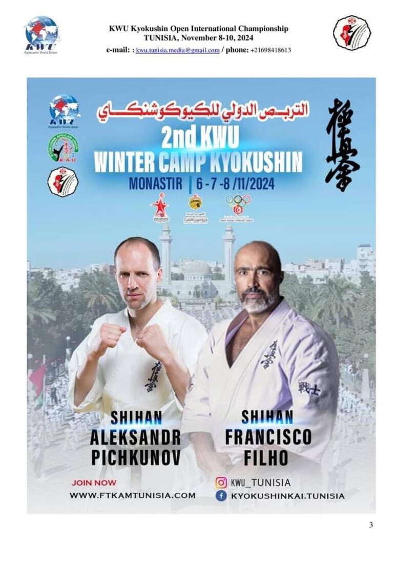 ويشارك يوم الجمعة 8 نوفمبر 250 مدربا في تربص خاص بمعلم قصر الرباط الأثري، ويوم السبت 9 نوفمبر القادم 150 حكما في تربص حول التحكيم الدولي تحت إشراف شيهان الكسندر بيشكونوف رئيس الاتحاد العالمي للكيوكوشنكاي.