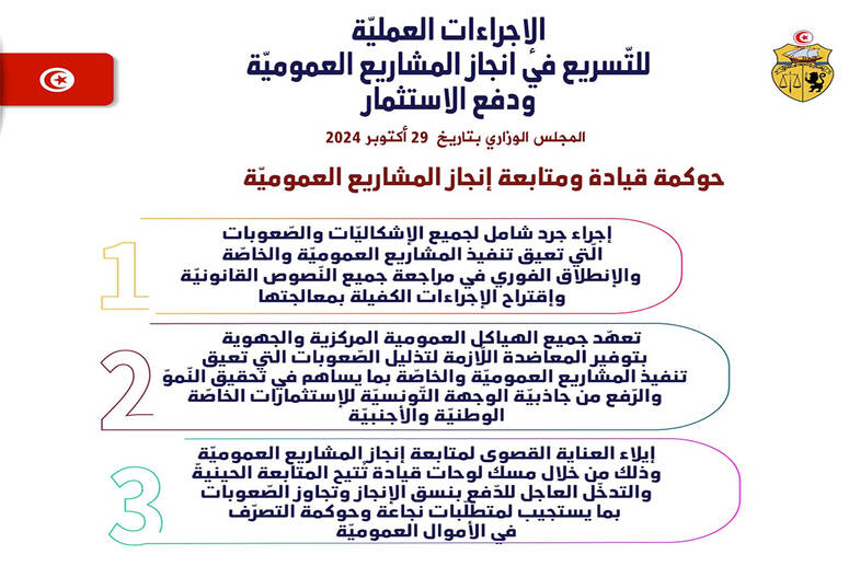 ويمثل هذا القرار من بين مخرجات المجلس الوزاري، الذّي انعقد بتاريخ 29 أكتوبر 2024، والذّي خصّص للإجراءات الرامية للتسريع في إنجاز المشاريع ودفع الاستثمار، كما يأتي ذلك في إطار حوكمة قيادة ومتابعة إنجاز المشاريع العمومية، اعتبارا إلى أنّ الإستثمار العمومي هو القاطرة.
