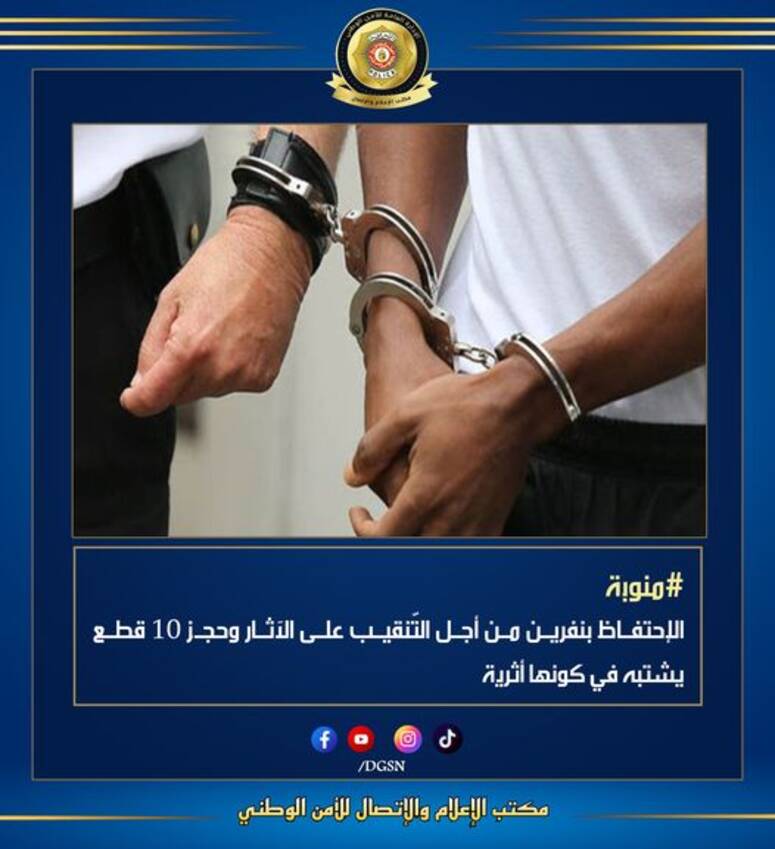 أذنت النيابة العمومية بمنوبة، بالإحتفاظ بشخصين من أجل "التنقيب على الآثار" وإدراج آخر بالتفتيش، وذلك بعد أن تم حجز 10 قطع يشتبه في كونها أثرية.
