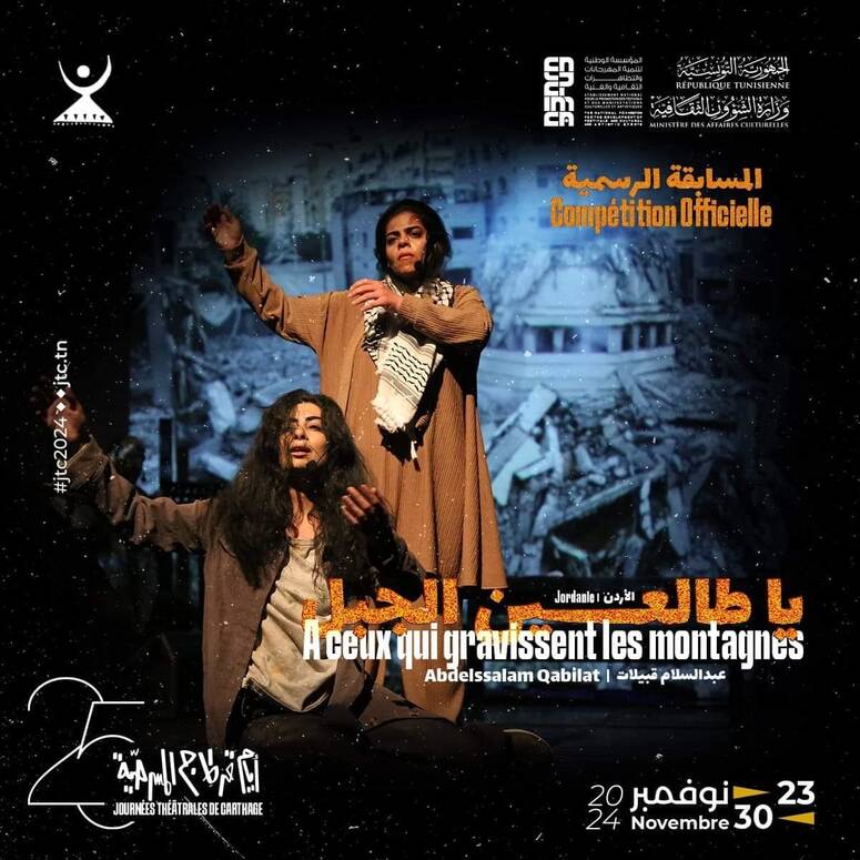 ضمن فعاليات المسابقة الرسمية لأيام قرطاج المسرحية 2024، قدمت فرقة مسرح الشمس الأردنية عرضا بعنوان "يا طالعين الجبل"، مساء اليوم الأربعاء بقاعة الفن الرابع بتونس، وهو عمل من إخراج عبد السلام قبيلات الذي سلّط فيه الضوء على معاناة الشعب الفلسطيني تحت وطأة الاحتلال الصهيوني مع إبراز التضحيات التي قدّمها الفلسطينيون على مدى عقود من الاحتلال.