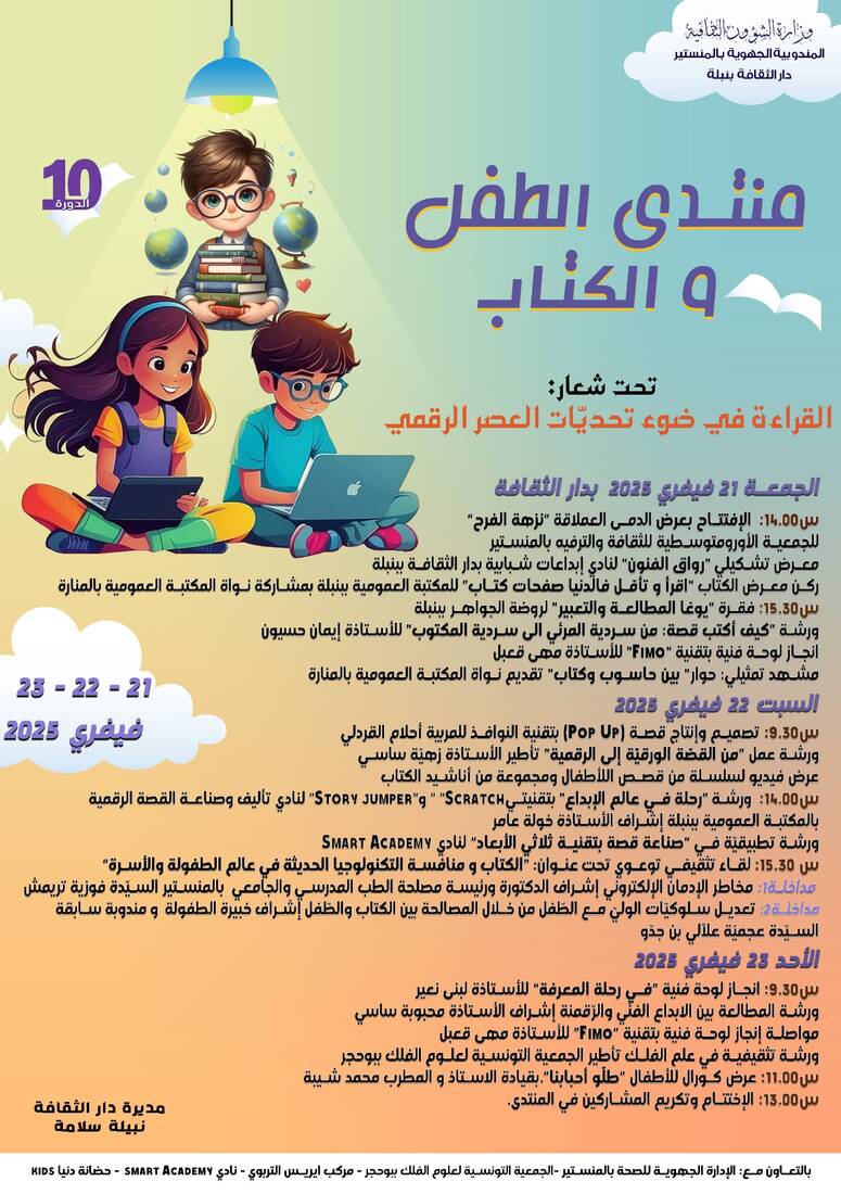 المنستير: الدورة العاشرة "لمنتدى الطفل والكتاب" تحت شعار "القراءة في ضوء تحديات العصر الرقمي" بدار الثقافة ببنبلة من 21 إلى 23 فيفري