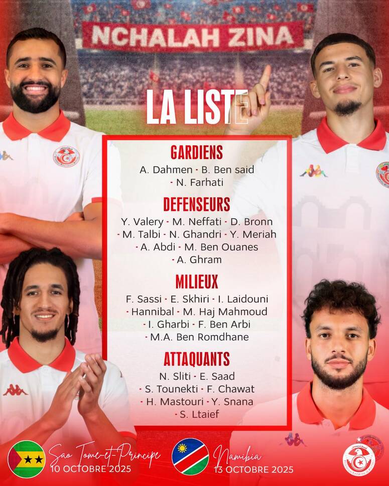 أعلن الناخب الوطني سامي الطرابلسي، اليوم الخميس، عن قائمة لاعبي المنتخب التونسي لكرة القدم المدعوين للمباراتين القادمتين أمام كل من ساوتومي وناميبيا يومي 10 و13 أكتوبر الجاري بملعب حمادي العقربي برادس، وذلك في إطار الجولتين التاسعة والعاشرة من التصفيات الإفريقية المؤهلة إلى نهائيات كأس العالم 2026 المقررة بكندا والولايات المتحدة والمكسيك.