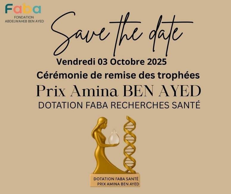 انتظم أمس الجمعة، حفل إسناد منحة مؤسسة عبد الوهاب بن عياد "فابا" للصحة - جائزة "أمينة بن عياد" في دورتها الثانية، وذلك لتشجيع الباحثين الشبان على البحث في مجالات الصحة والابتكار العلمي.