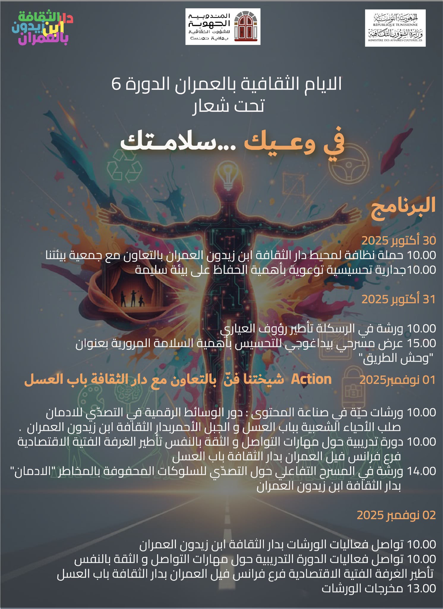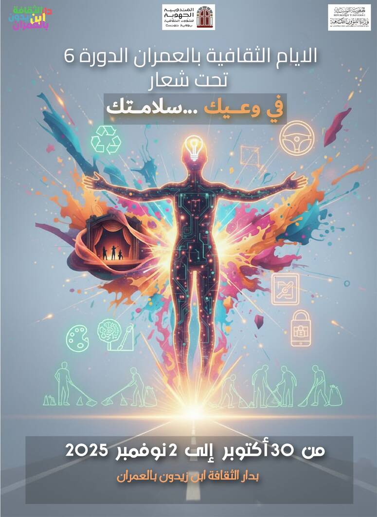 تنظم دار الثقافة ابن زيدون بالعمران (ولاية تونس) تظاهرة الأيام الثقافية في دورتها السادسة من 30 اكتوبر الحالي الى 2 نوفمبر القادم تحت شعار "في وعيك ...سلامتك"