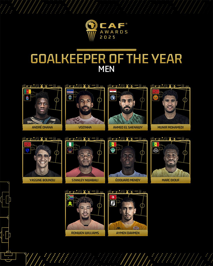 أندري أونانا، ياسين بونو، إدوارد ميندي، رونوان ويليامز، وأيمن دحمان (تونس).جائزة أفضل لاعب في الأندية