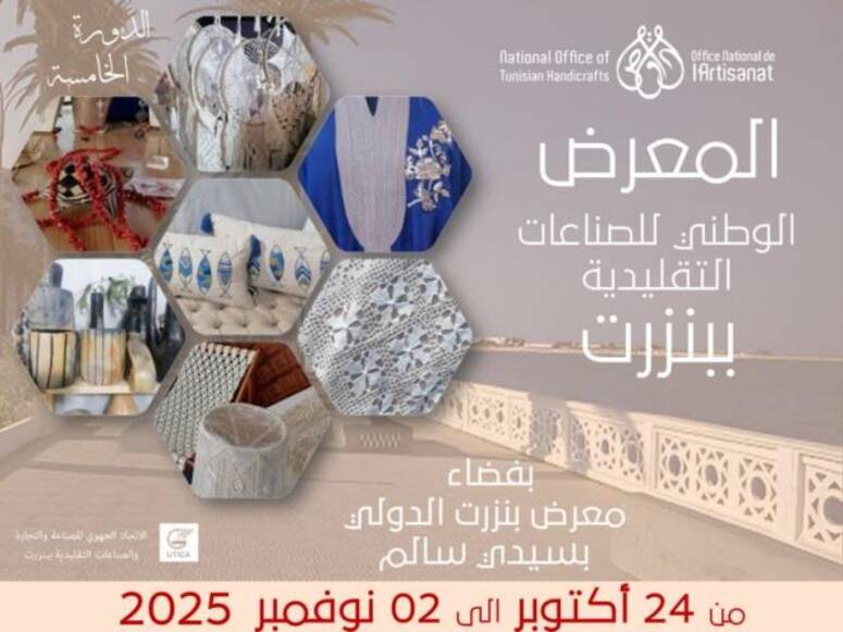 تنظم، المندوبية الجهوية للصناعات التقليدية ببنزرت بالاشتراك مع الاتحاد الجهوي للصناعة والتجارة والصناعات التقليدية، الدورة الخامسة للمعرض الوطني للصناعات التقليدية، من 24 أكتوبر الى 02 نوفمبر 2025، وذلك بفضاء معرض بنزرت الدولي.