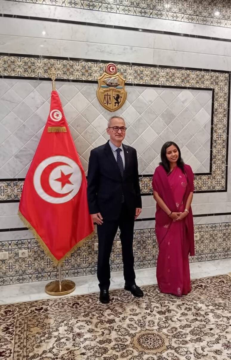 وقدم كاتب الدولة بالمناسبة التهاني للسفيرة الهندية بمناسبة تقديمها لاوراق اعتمادها لرئيس الجمهورية قيس سعيد يوم 06 نوفمبر الجاري