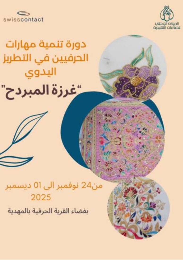 تنظيم دورة تنمية معارف وقدرات الحرفيين في التطريز اليدوي "غرزة المبردح" من 24 نوفمبر الجاري إلى 1 ديسمبر 2025 بالمهدية