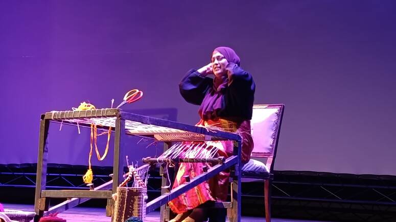 حوّلت سعاد الركح الى ورشة فيها منسجها وخيوط ودف وزيّنته بنماذج من منتوجاتها فتحرّكت بين كل هذه العناصر، مرّة جالسة امام المنسج تعدّل خيوطه مثلما يعدّل العازف أوتار العود، ومرة تحاكي إحدى لوحاتها، وبين هذا وذاك، تدندن، احيانا، بصوت جريح يكشف بداخلها معاناة وصراعا داخليا، إمّا من خلال الالحان او عبر الاغاني المنتقاة قائلة: "ما قلت أحّيت كيف الجمل حملي وما قلت أحّيت سامعة الكلام فمّي وبقلبي غنّيت" .