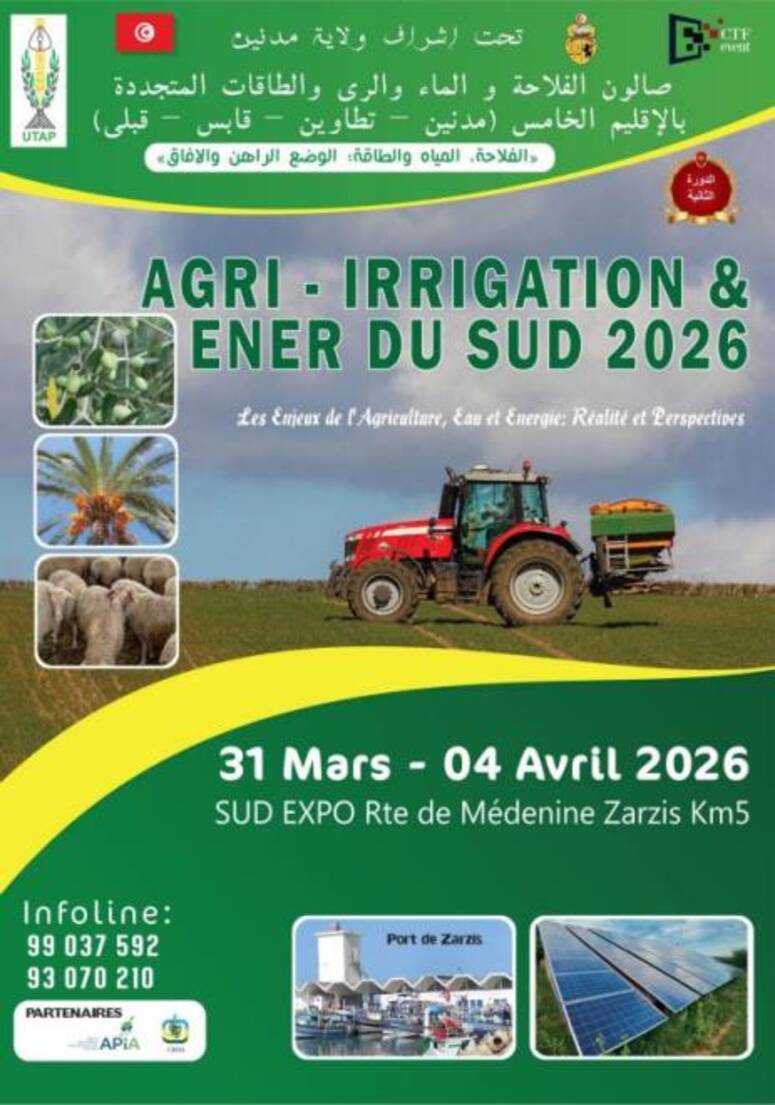 تحتضن ولاية مدنين، الدورة الثانية لصالون الفلاحة والماء والري والطاقات المتجددة بالاقليم الخامس (مدنين، تطاوين، قابس، قبلي)، وذلك من 31 مارس الى 4 أفريل 2026